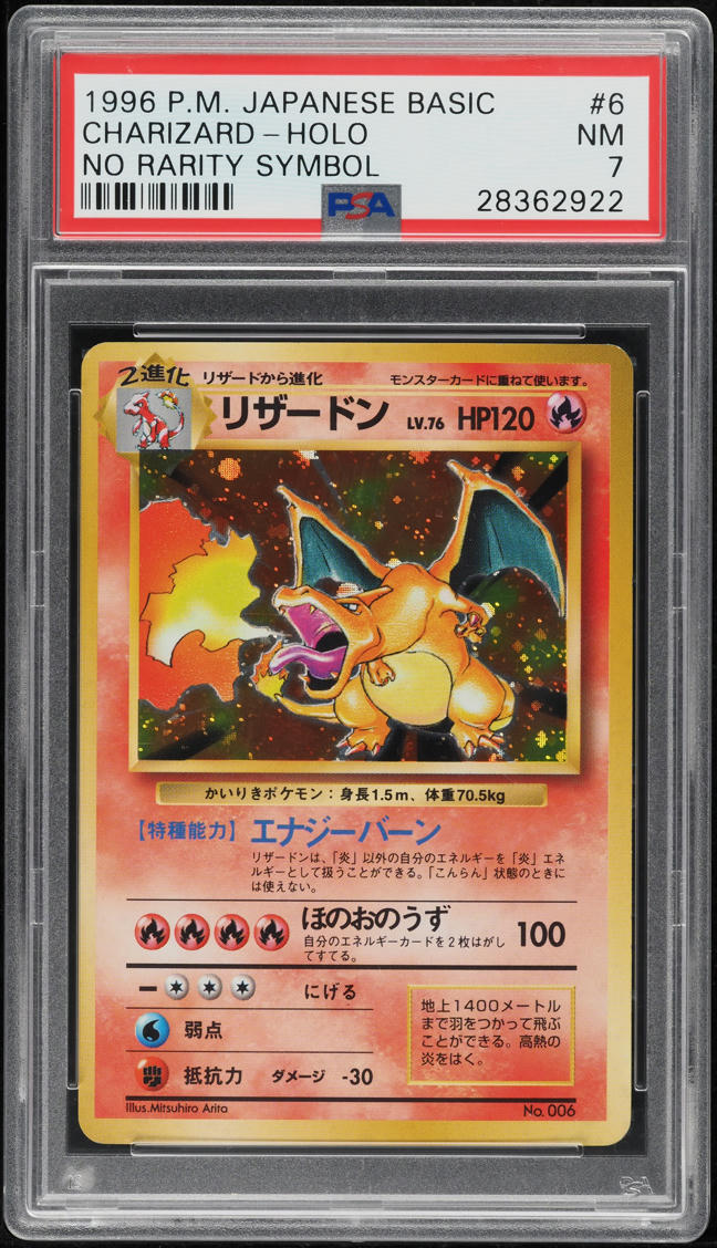1996 POKEMON JAPANESE BASE SET NO RARITY SYMBOL HOLO CHARIZARD #6 PSA 7 NRMT