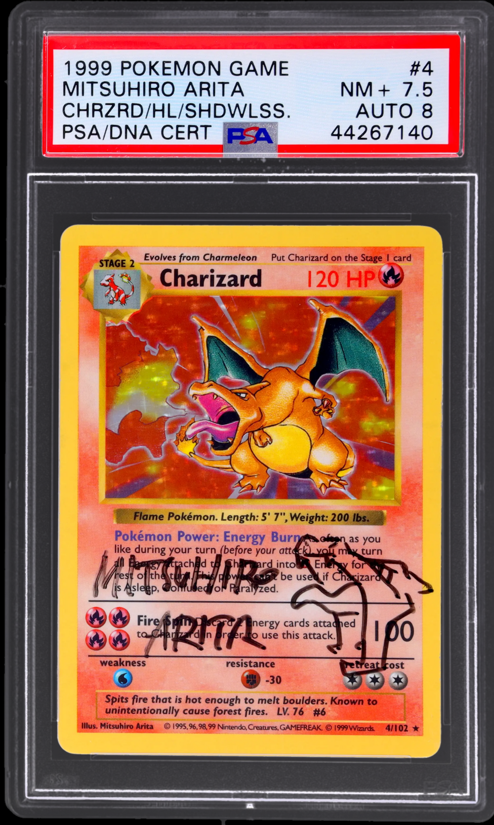 1999 POKEMON BASE SET SHADOWLESS HOLO CHARIZARD #4 ARITA AUTO 8 PSA 7.5